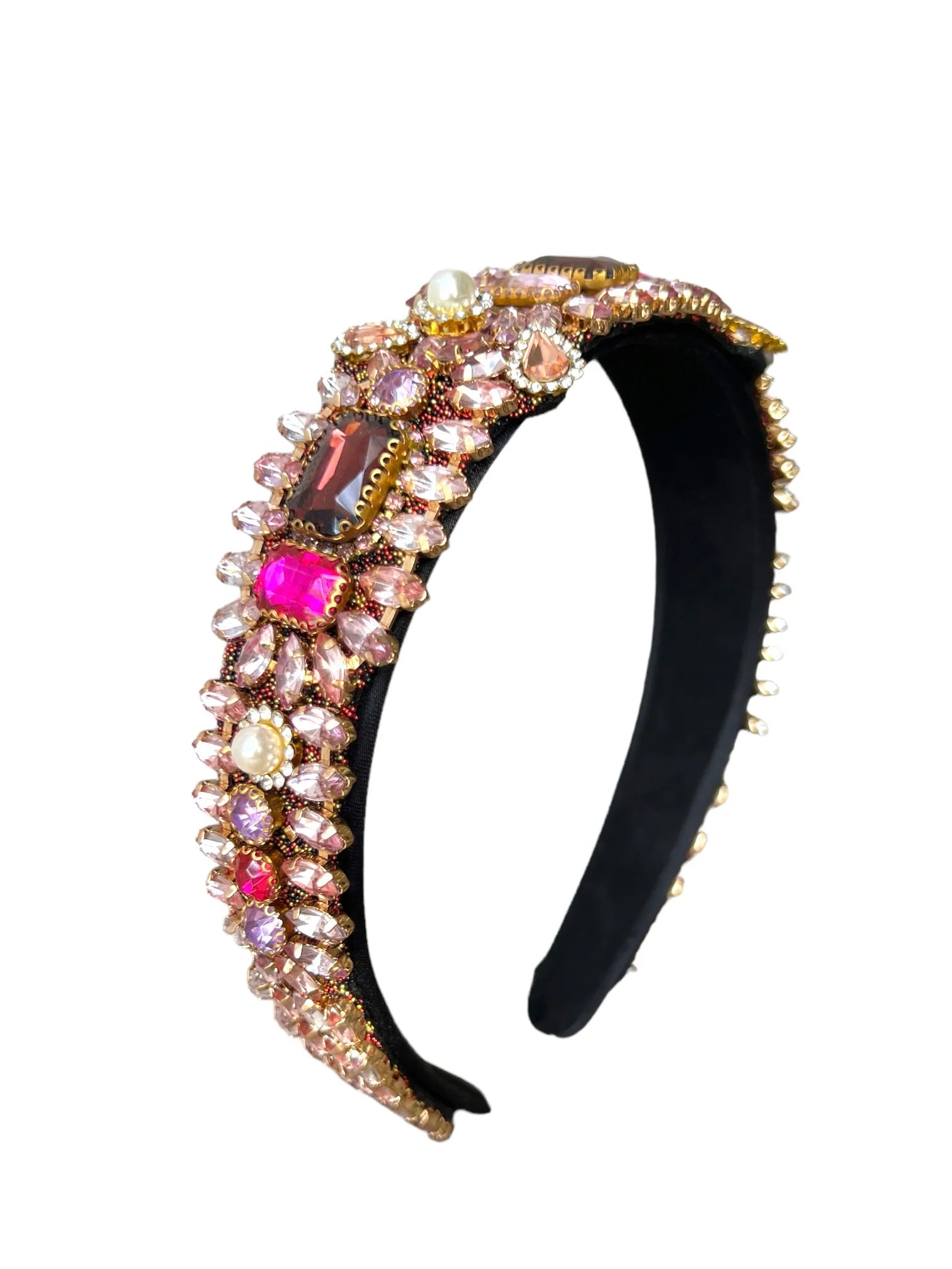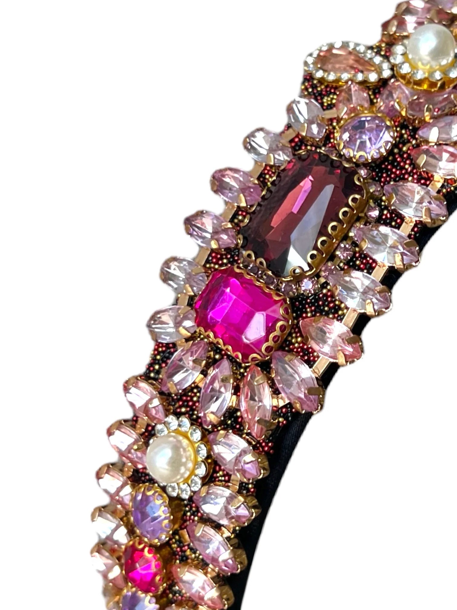 The Aurora Headband—a striking statement piece adorned with large pink rhinestones and pearls. This pink dream pairs perfectly with our Alina Dress.